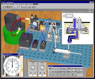 Es un programa basado en Windows que cubre los fundamentos de neumática y Control eléctrico de los sistemas neumáticos reproduce un laboratorio de neumática tridimensional sobre una pantalla de computadora. El equipo real del Sistema didáctico en neumática de Lab-Volt es reemplazado por imágenes tridimensionales, que los estudiantes pueden manipular en la pantalla de la computadora teniendo la posibilidad de ver cada uno de sus componentes con vistas detalladas en corte, percibiendo así la circulación del fluido, como también la función de cada elemento. |