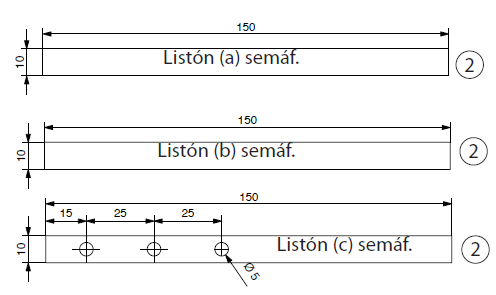 1. Perforar los listones de madera (1,2) y la varilla redonda (5) según la plantilla de corte (pág. 5). Redondear los cantos del listón (h) con la escofina. Lijar bien todos los cantos de corte. Desbarbar las perforaciones con una avellanadora. Hacer una perforación de ø5 mm y unos 15-20mm de profundidad en el centro de la barra redonda (3). |