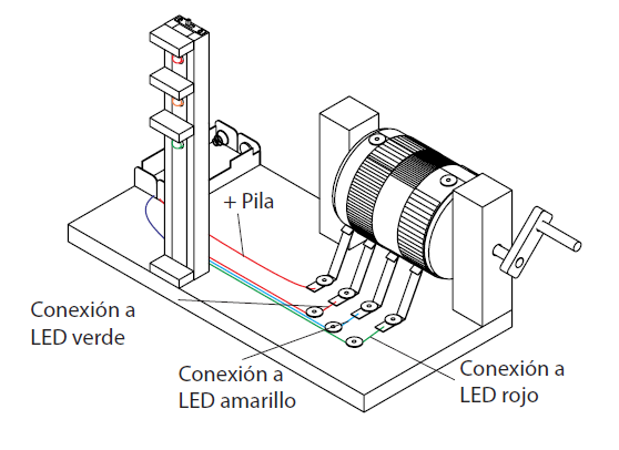 Conectar otro pedazo de cable (150 mm) con el ánodo (+) del LED verde (13) y soldar el otro extremo del cable con la tercera tira de latón en el cilindro de contacto.