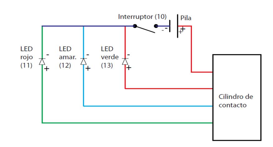 11. Pelar un trozo de 250 mm de cable eléctrico (14) y soldar el ánodo (+) del LED rojo (11). Soldar el otro extremo del cable con la cinta de latón en el extremo exterior del cilindro de contacto (ver esquema de conexiones).